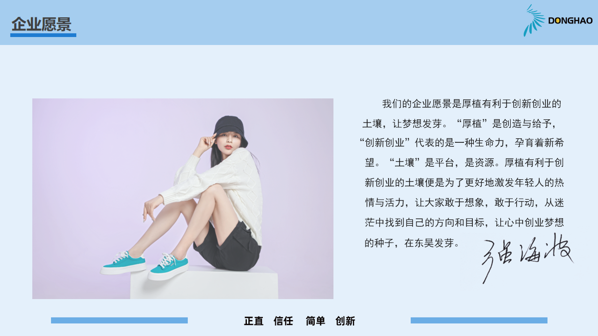 我們的企業(yè)愿景是厚植有利于創(chuàng)新創(chuàng)業(yè)的土壤,讓夢(mèng)想發(fā)芽。創(chuàng)者,始造也。“厚植”是創(chuàng)造與給予,“創(chuàng)新創(chuàng)業(yè)”代表的是一種生命力,孕育著新希望。“土壤”是平臺(tái),是資源。